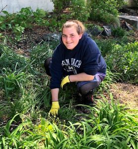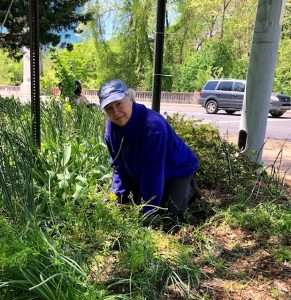 Frances Buttenheim cleaning out the garden on Market Street